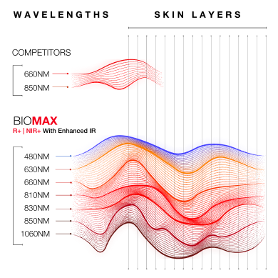 featuring the seven wavelengths of 480nm /630nm /660nm/ 810nm /830nm/850nm/1060nm. Please check out the following article for more information on our spectrum and the percentages of each wavelength: R+ |